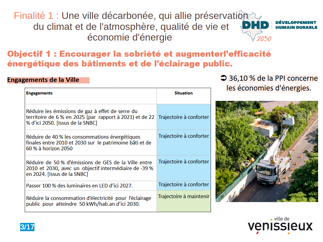 Le premier objectif concerne la maitrise et la décarbonation des consommations énergétiques. Les indicateurs sont encourageant, mais les GES ont une très grande inertie donc il faut conforter les efforts. La consommation d’électricité de l’éclairage public est à 53kWh en 2024, l’objectif étant à 50kWh. Le passage en LED des luminaires s’est poursuivis, 48 % des luminaires publics sont en LED en 2024. Nous tenons la trajectoire pour l’objectif de 100 % en 2027