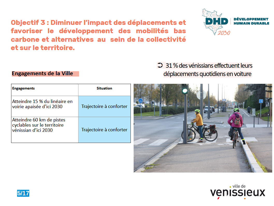 Le troisième objectif concerne les déplacements, les mobilités bas carbone sur la collectivité et le territoire. Il n’y a que 31% des habitants qui effectuent leur déplacement quotidien en voiture, il y en a un peu plus qui font leur déplacement à pied. On oublie toujours que 30% n’ont pas de voiture. Quand on parle du stationnement, il ne faut jamais l’oublier. Les 15% du linéaire en voie apaisée, c’est à conforter. On a eu une transformation qualitative très importante avec les voiles lyonnaises, mais en kilomètres de pistes cyclables, ça ne fait pas forcément un gros progrès, mais c’est quand même un gros changement qualitatif pour ceux qui les utilisent.