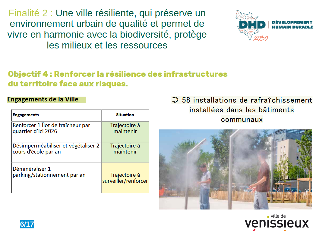 Une ville résiliente qui protège un environnement humain de qualité, c’est tout l’enjeu de l’adaptation au changement climatique, avec le renforcement des îlots de fraîcheur, l’inauguration de la célèbre aire aqualudique du Coblot, qui est un magnifique succès, mais aussi la poursuite de la désimperméabilisation et végétalisation des cours d’école et de l’espace public, de tout le travail sur le rafraîchissement dans les bâtiments scolaires avec les brasseurs d’air ou les brumisateurs.