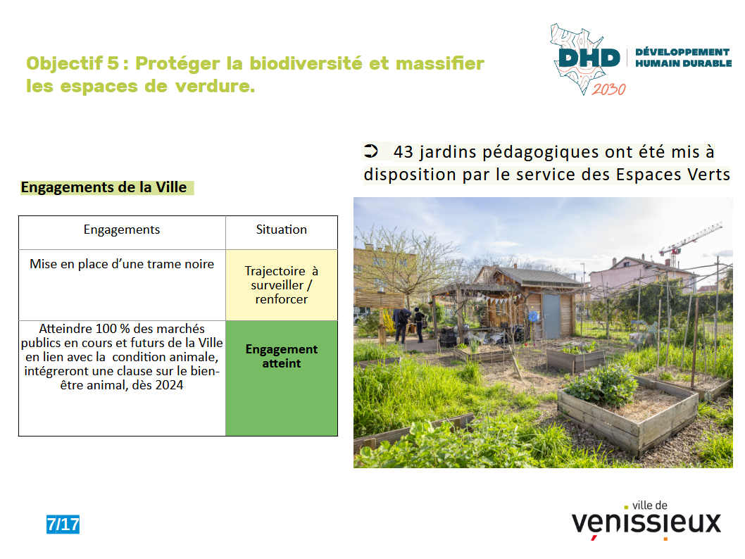 Objectif 5, protéger la biodiversité et massifier les espaces de verdure. Vous avez une magnifique photo du jardin Stoppa, un nouveau jardin inauguré en 2025 avec les habitants et le conseil de quartier. Tout l’enjeu aujourd’hui, c’est la question de la continuité, du maillage à la fois vert et noir. C’est peut-être le sujet qui est le plus compliqué. On a un travail en cours d’identification des continuités sombres possibles, mais c’est un sujet difficile. En tout cas, nous avons atteint l’engagement de 100% des marchés publics en cours qui intègrent une clause sur la condition animale.