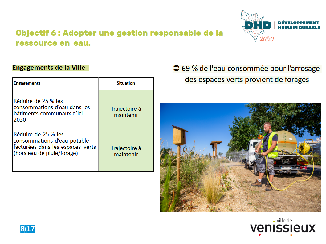 L’objectif numéro 6 porte sur une gestion responsable de la ressource en eau. On est plutôt bon, mais c’est une trajectoire qu’il faut maintenir. On a une réduction de 25% des consommations d’eau dans les bâtiments communaux et de l’eau potable consommée par les espaces verts, ce qui est une très bonne chose. On a développé une stratégie de récupération d’eau de pluie et de forage Ce résultat de 25%, il faut le commenter parce que c’est un défi. Ça veut dire tracer, identifier les fuites au plus tôt parce que c’est l’enjeu ce n’est pas simplement les pratiques et les consommations des gens qui laissent couler l’eau. C’est aussi tout le problème des fuites éventuelles et de notre capacité à les détecter et à les traiter.