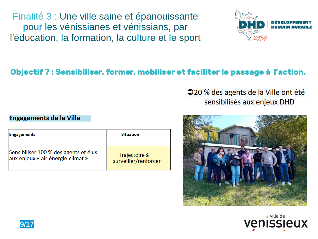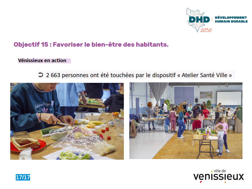 La troisième finalité concerne une ville saine et épanouissante pour les vénissians. Vous avez ici une photo d’action de sensibilisation. 20% des agents ont participé à une animation sur les sujets du DHD, 442 agents, c’est vraiment très significatif, il faut remercier encore une fois toute l’équipe et les référents qui organisent ces actions, et puis auprès du grand public aussi, avec 245 personnes. Ce qui n’est pas négligeable, même si là on pourrait se dire qu’il faut arriver à faire plus. et c’est tout l’enjeu du travail partenarial avec les conseils de quartier.