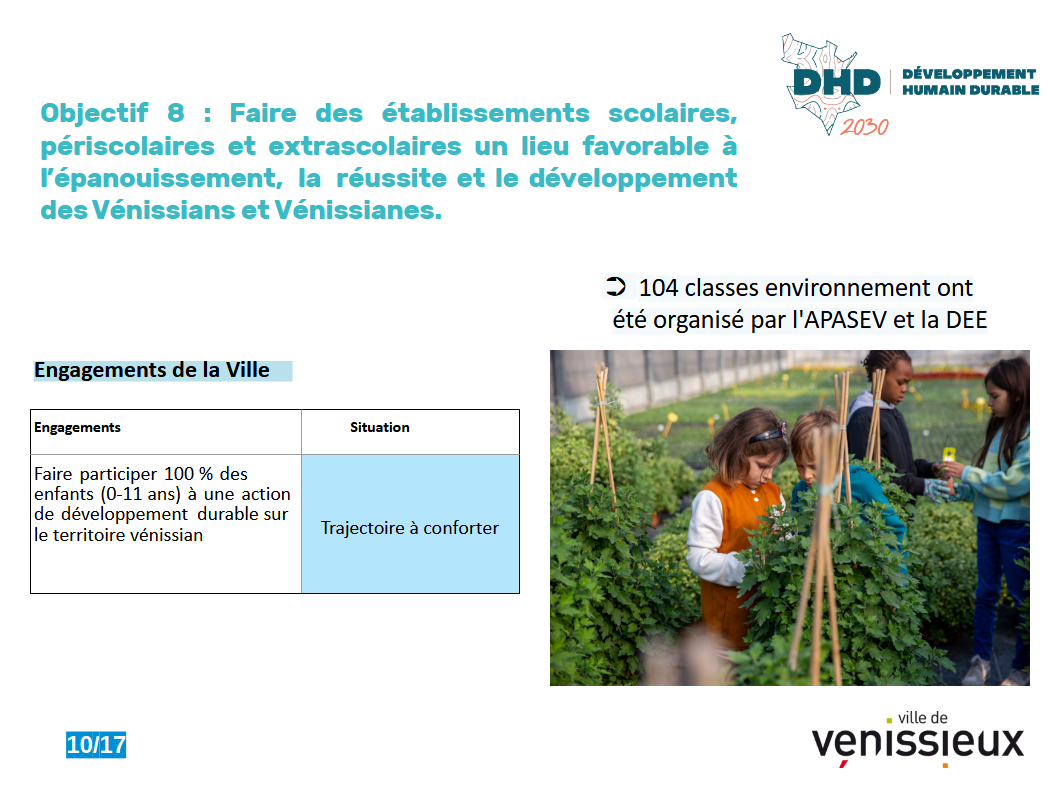 L’objectif numéro 8 c’est des écoles comme un lieu favorable à l’épanouissement, la réussite, le développement des enfants. En 2024 la reprise des classes d’environnement à Eyzin Pinay. 104 classes ont été organisées par l’APASEV et la DEE. Notre engagement, c’est de faire participer 100% des enfants de 0 à 11 ans à une action de développement durable sur le territoire, un engagement sur lequel nous travaillons et qui progresse.