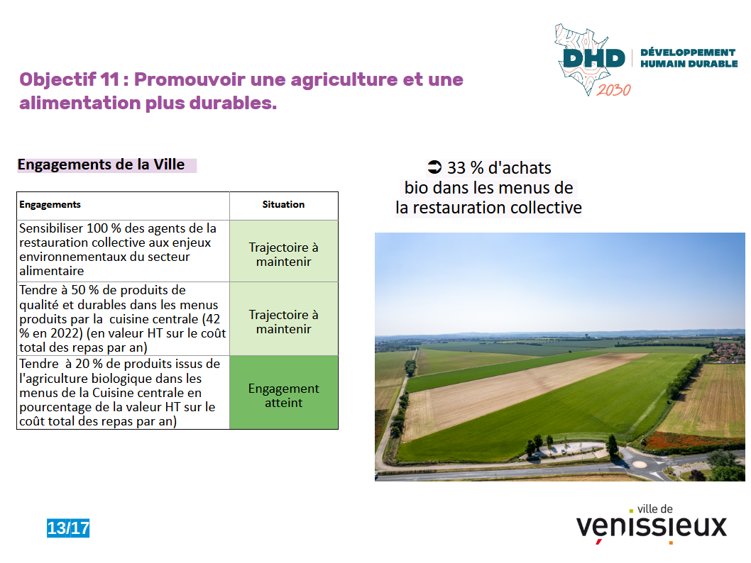 L’objectif numéro 11 concerne l’agriculture et une alimentation durable, un sujet sur lequel il y a plein de choses à faire sur le développement agricole, le développement du maraîchage urbain, des jardins, etc. Pour la première fois, nous dépassons largement les 20% de produits bio dans les achats de la cuisine centrale, 20%, c’est l’objectif de la loi. Nous sommes à 33%, ce qui est très significatif.