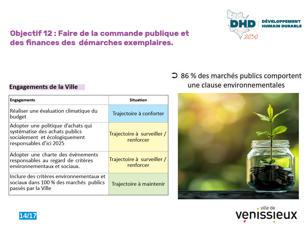 L’objectif numéro 12 porte des démarches exemplaires sur la commande publique et les finances.Il y a beaucoup de choses sur notre politique d’achat, avec 86% des marchés publics qui comportent une clause environnementale. Il y a des éléments à renforcer sur la charte des événements responsables, notamment, sur laquelle on a un certain nombre de choses qui existent, mais qu’il faudrait arriver à systématiser.