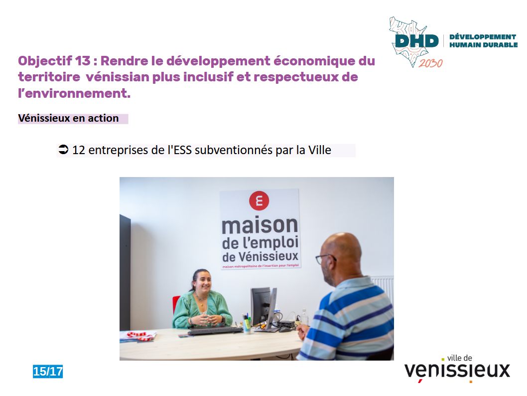 L’objectif 13 porte sur un développement économique plus inclusif et respectueux de l’environnement. C’est le partenariat avec les entreprises avec un énorme travail avec le réseau des entreprises vénissianes engagées dans une démarche DHD. C’est un vrai succès de l’année 2025.