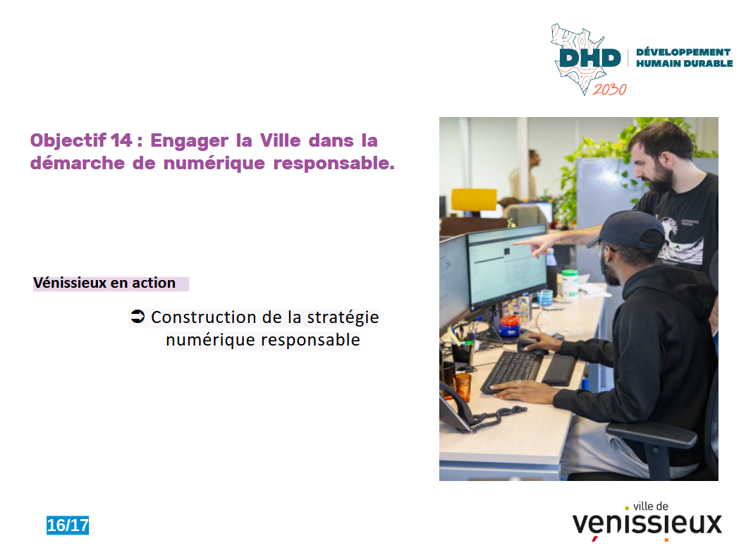 L’objectif numéro 14, c’est le numérique responsable, un sujet sur lequel là on a beaucoup avancé ces derniers temps, avec la mobilisation des référents pour faire le diagnostic de l’existant et la construction de la stratégie numérique responsable.