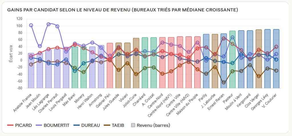 Mais le défi est posé à toutes les forces sociales de la ville ; unir, résister, agir ensemble, quelles que soient nos origines, nos quartiers, nos religions. Michèle Picard a mobilisé dans beaucoup de quartiers entre les deux tours, y compris dans des quartiers des minguettes (+172voix) , comme dans le Moulin à vent (+160voix). Idir Boumertit se concentre lui sur les quartiers des minguettes (+434 voix) délaissant le Moulin à vent (+61 voix). La progression entre les deux tours pour Michèle Picard devra être analysée car le revenu médian n’est pas une explication des différences entre les bureaux.
