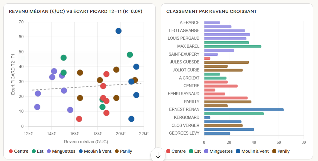 Le « nuage de points » à gauche montre des bureaux où la progression est forte (points en haut), d’autres où elle est faible (points en bas), aussi bien dans les bureaux les plus populaires (à gauche), que plus aisés (à droite).
