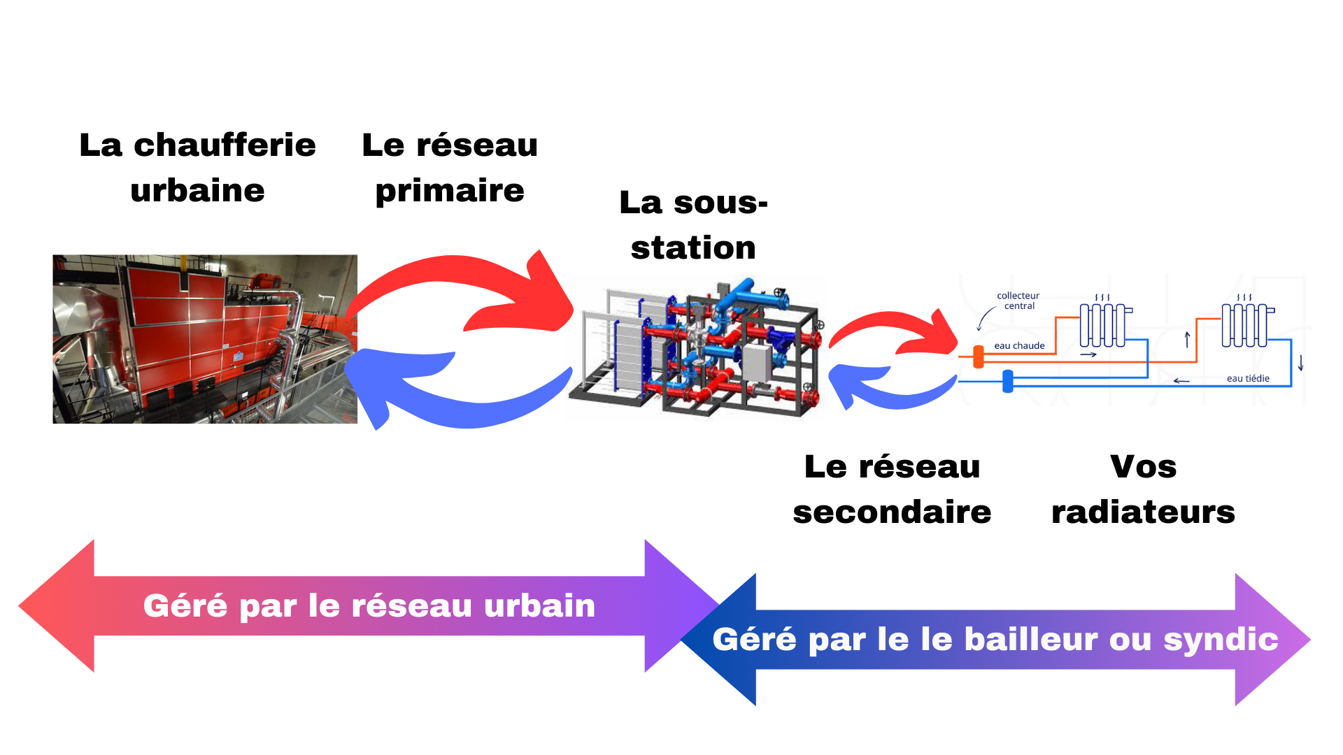 L’eau réchauffée par les grandes chaufferies est poussée dans le réseau urbain autour de 100°C. C’est le réseau primaire, celui qui passe dans les rues. A chaque « sous-station », l’eau du primaire passe dans un échangeur qui réchauffe l’eau d’un « réseau secondaire », celui qui circule dans les immeubles et qui arrive dans le radiateur. L’eau du réseau primaire ne passe donc jamais dans vos immeubles, elle reste dans la rue et tourne en boucle dans le réseau, se réchauffant à la chaufferie, se refroidissant dans les sous-stations et revenant vers 70°C à la chaufferie…