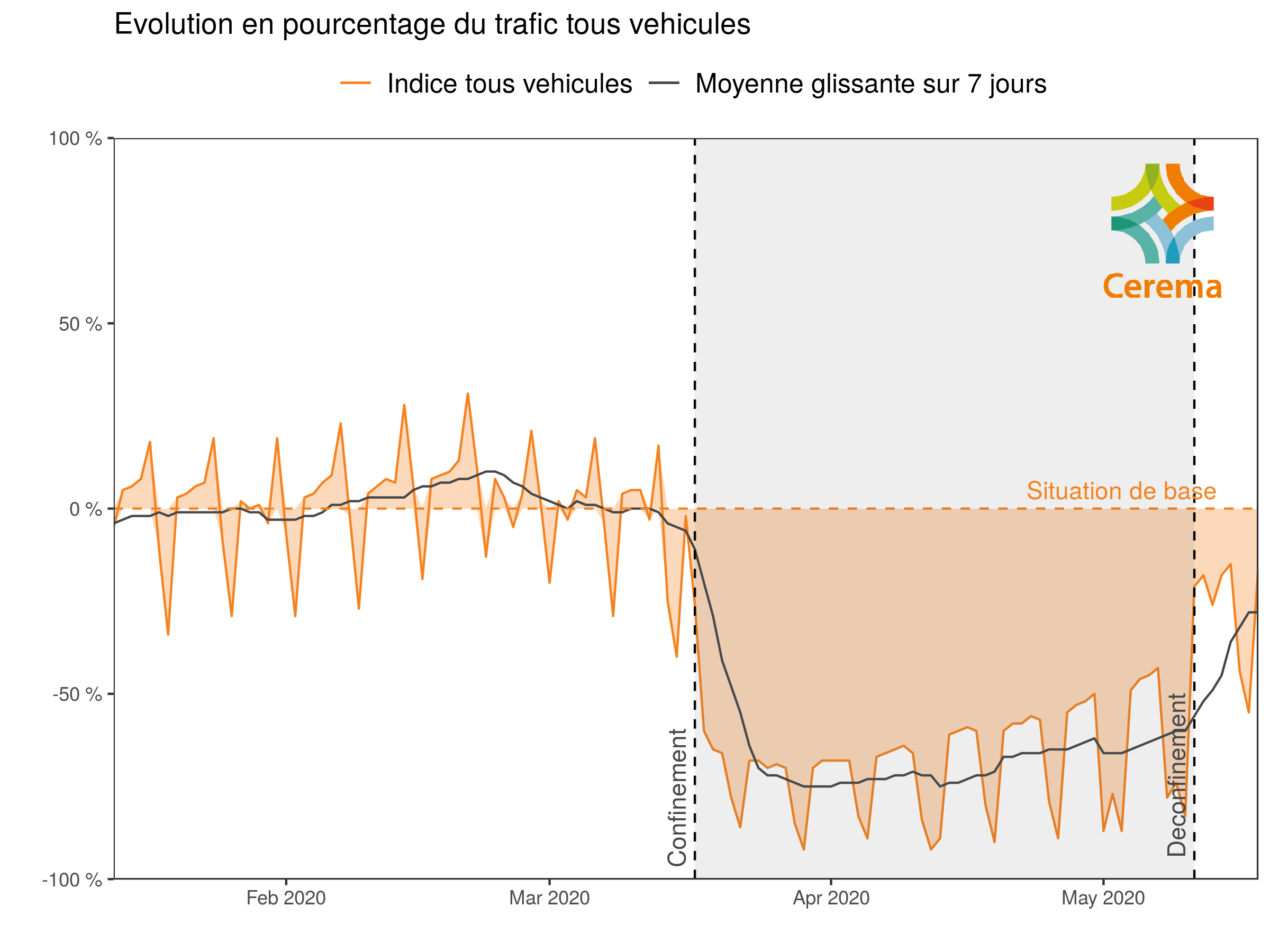 C’est vrai pour les flux voitures. Si nous ne sommes plus dans cette situation surprenante des rues vides pendant le confinement, nous sommes très loin d’avoir retrouvé le niveau de circulation précédent. Le CEREMA, un centre technique réputé pour ses études sur les déplacements, publie quotidiennement un graphique mis à jour avec le volume global de déplacements par rapport à une situation normale. La dernière semaine de confinement, les déplacements représentaient en gros 50% de la normale, et la première semaine de déconfinement, 80%, sachant que la part des poids lourds est elle supérieure à la normale, et donc que pour les automobiles, on est encore en dessous.