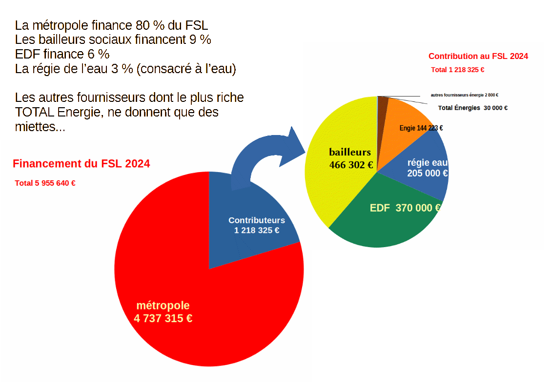 Ce FSL a plusieurs parties, l’eau, l’aide au maintien dans le logement (aides au paiement des loyers) et des aides à l’accès au logement. La métropole finance 80 % du FSL, les bailleurs sociaux financent 9 %, EDF en finance 6 %, la régie de l’eau finance 3 % qui sont consacrés à l’eau, et les autres fournisseurs dont le plus riche TOTAL Energie, ne donnent que des miettes… !
