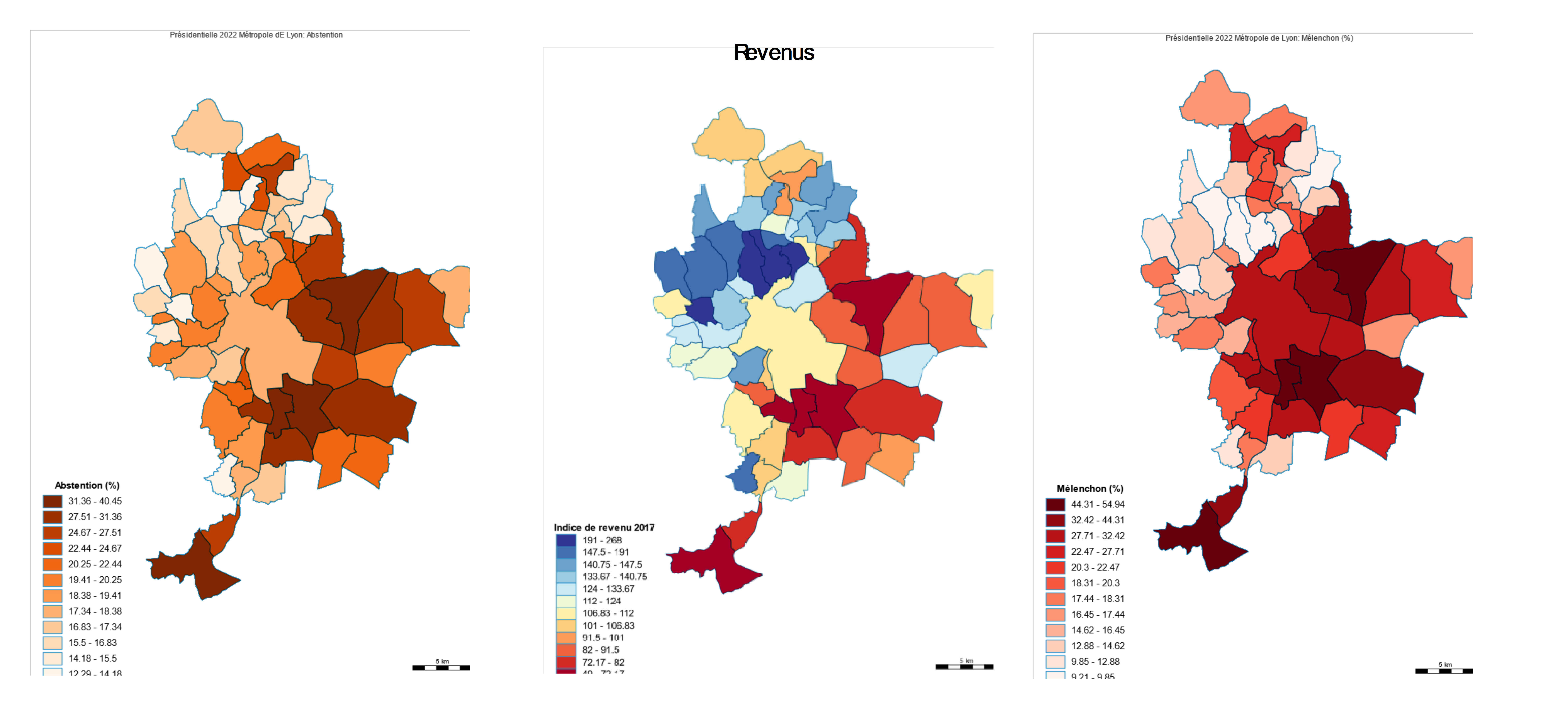 Prenons le cas de la métropole de Lyon. Le vote Mélenchon est élevé dans les villes populaires où les revenus sont bas et l’abstention est élevée, mais aussi dans la ville de Lyon où les revenus sont plus élevés et l’abstention est plus faible.