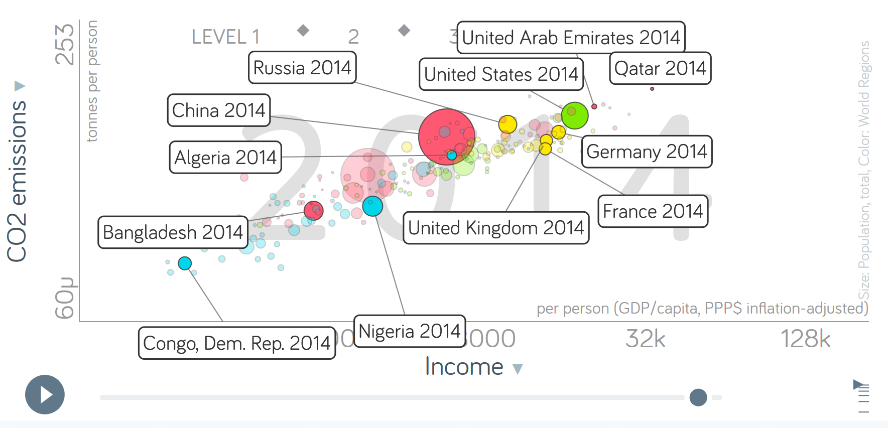 Ce graphique qui montre les émissions par personne et par pays montrer que l’urgence, c’est que certains pays doivent baisser rapidement leurs émissions (USA, Allemagne…) , quand d’autres ont le droit au contraire des les augmenter (Congo, Bengladesh…). L’armée US a un bilan carbone supérieur à plus de 100 pays ! Même dans le monde « occidental », les situations sont très hétérogènes, y compris en France entre les quartiers populaires et les quartiers aisés, ou le revenu médian est 4 à 5 fois supérieur. Les 9 millions de personnes en dessous du seuil de pauvreté en France connaissent déjà la « sobriété », même si le plus souvent, ils sont contraints à ne consommer que de la mauvaise qualité.. !