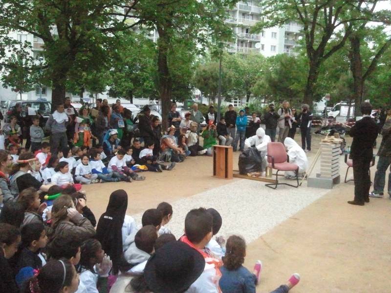 Il faut être honnête, la réussite est d’abord due à l’engagement de Tayeb, notre infatigable animateur et organisateurs des centres de loisirs, cycliste convaincu et quotidien par ailleurs, et qui apporte une belle contribution chaque année à cette semaine. Le carnaval est le résultat d’un travail de longue haleine, avec travail sur des slogans, des affiches, des banderoles, une intervention publique, qui aboutisse à ce carnaval, accompagné par une troupe de théâtre qui mimera au début la bataille entre le bon Mr propre et le méchant Mr déchets… bataille impressionnante (les comédiens font visiblement du sport de combat !), et qui fait rire les nombreux enfants, qui reprendront ensuite avec vigueur les slogans de l’équipe.
